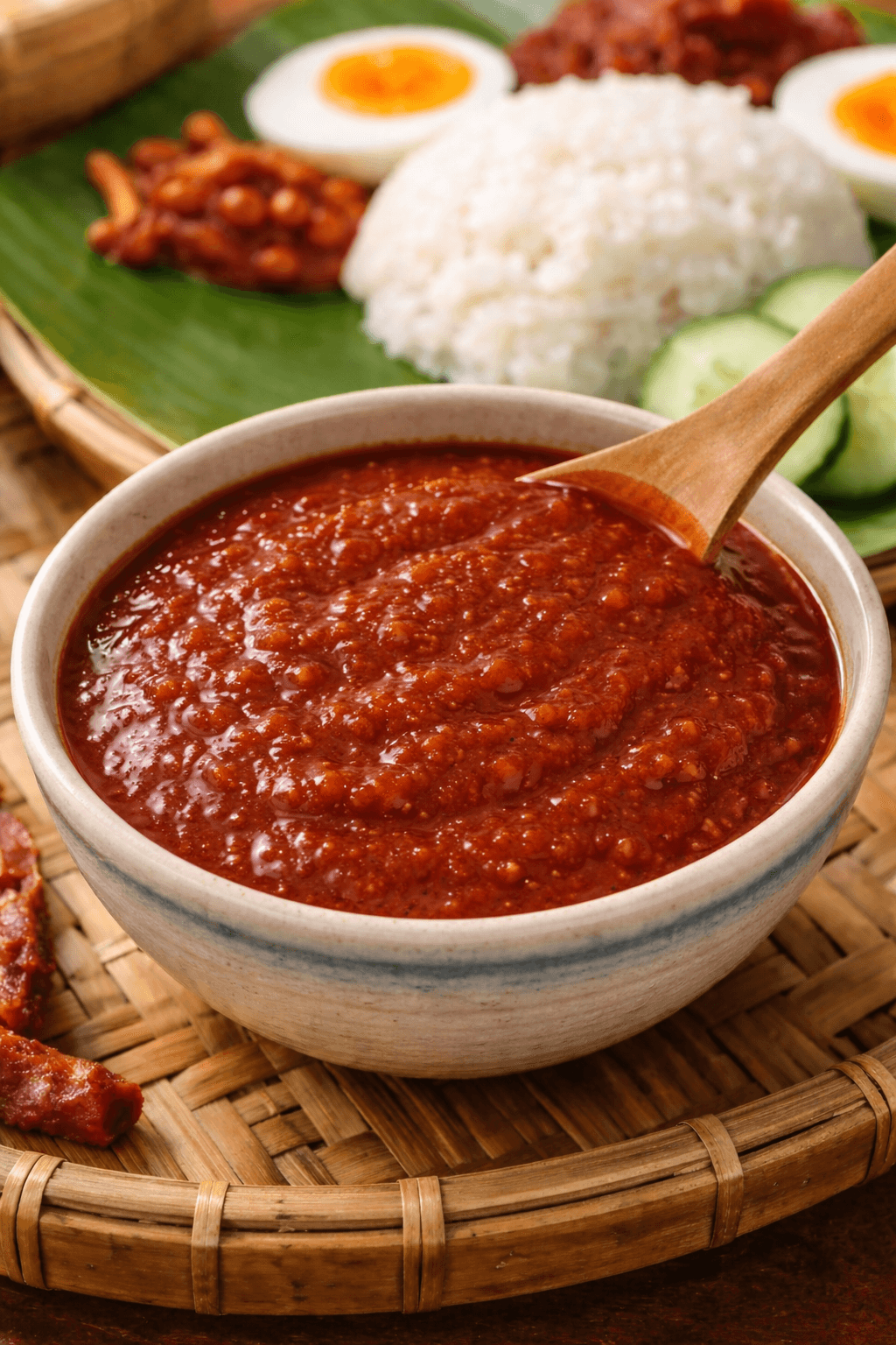A fiery and fragrant chilli condiment made with belacan, a traditional shrimp paste that creates an intense scrumptious heat.